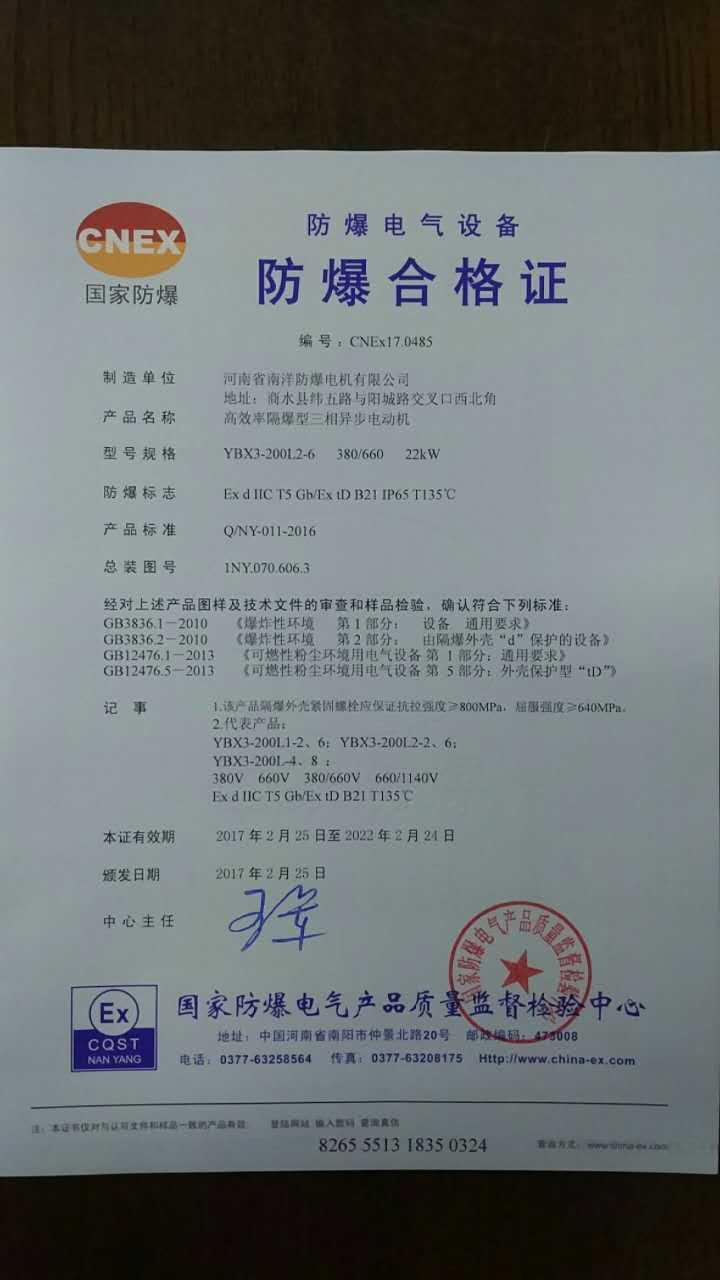 河南省南洋防爆電機(jī)有限公司全體員工經(jīng)過不懈努力,潛心專研,榮獲了由國家防爆電氣檢測中心,頒布的YBX3高效節(jié)能防爆電機(jī)防爆等級EXDIICT5,防護(hù)等級IP65的防爆合格證,為廣大企業(yè)的安全生產(chǎn)提供了有力保障。