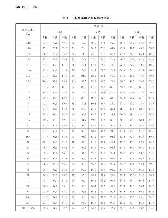 (2)提高了對三相異步電動機(jī)能效限定值要求(見表1,GB18613-2012的表1和GB 25958—2010的表1);